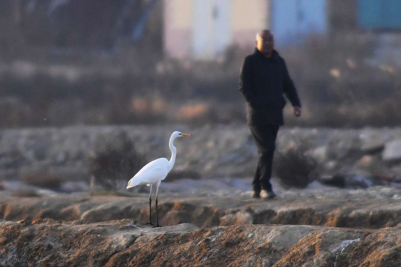 12月7日,一只白鹭在山东省青岛市城阳区河套街道滨海湿地目送行人走过身旁。
