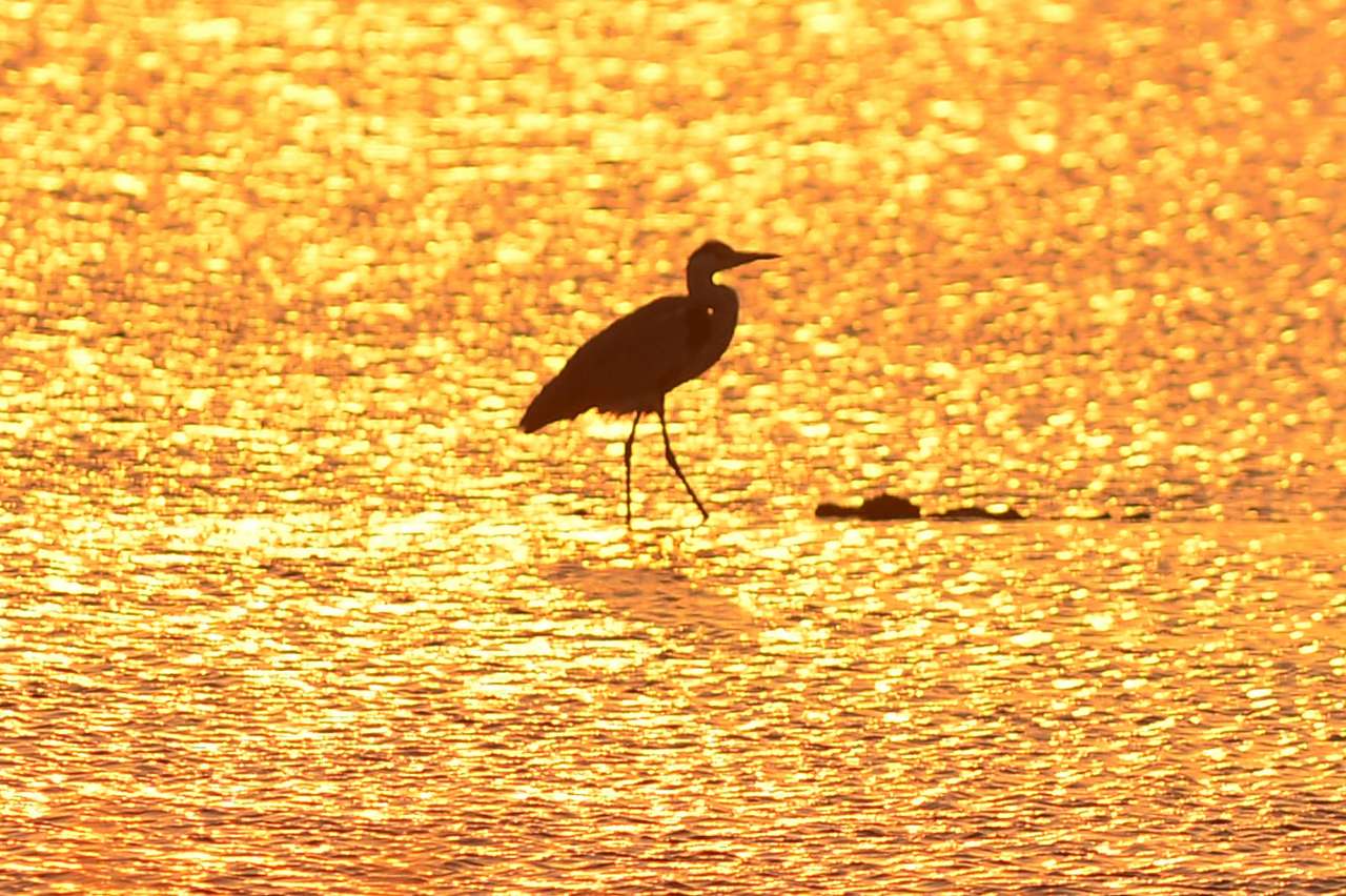 12月7日,一只苍鹭在山东省青岛市城阳区河套街道滨海湿地的水中踱步。