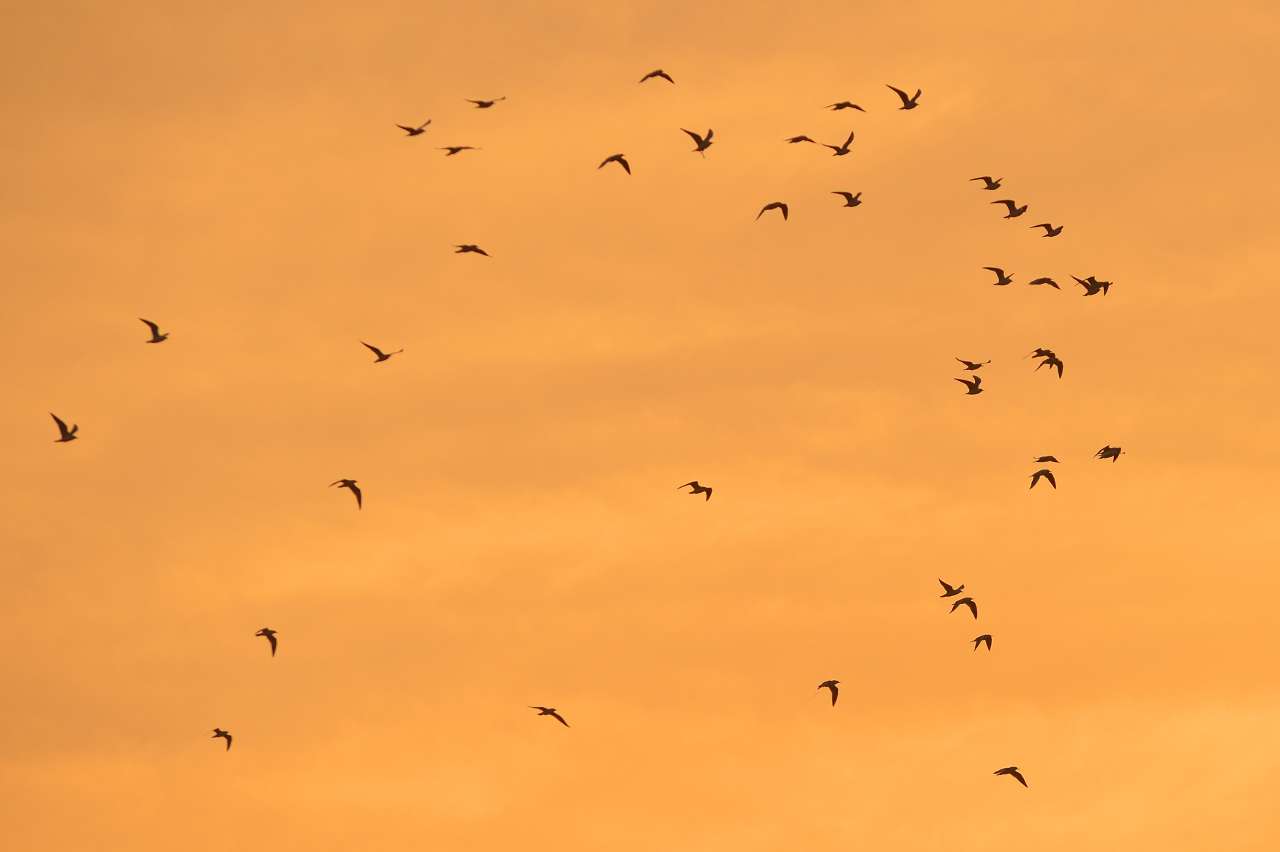 12月7日,成群红嘴鸥在山东省青岛市城阳区河套街道滨海湿地的晚霞中翔集。
