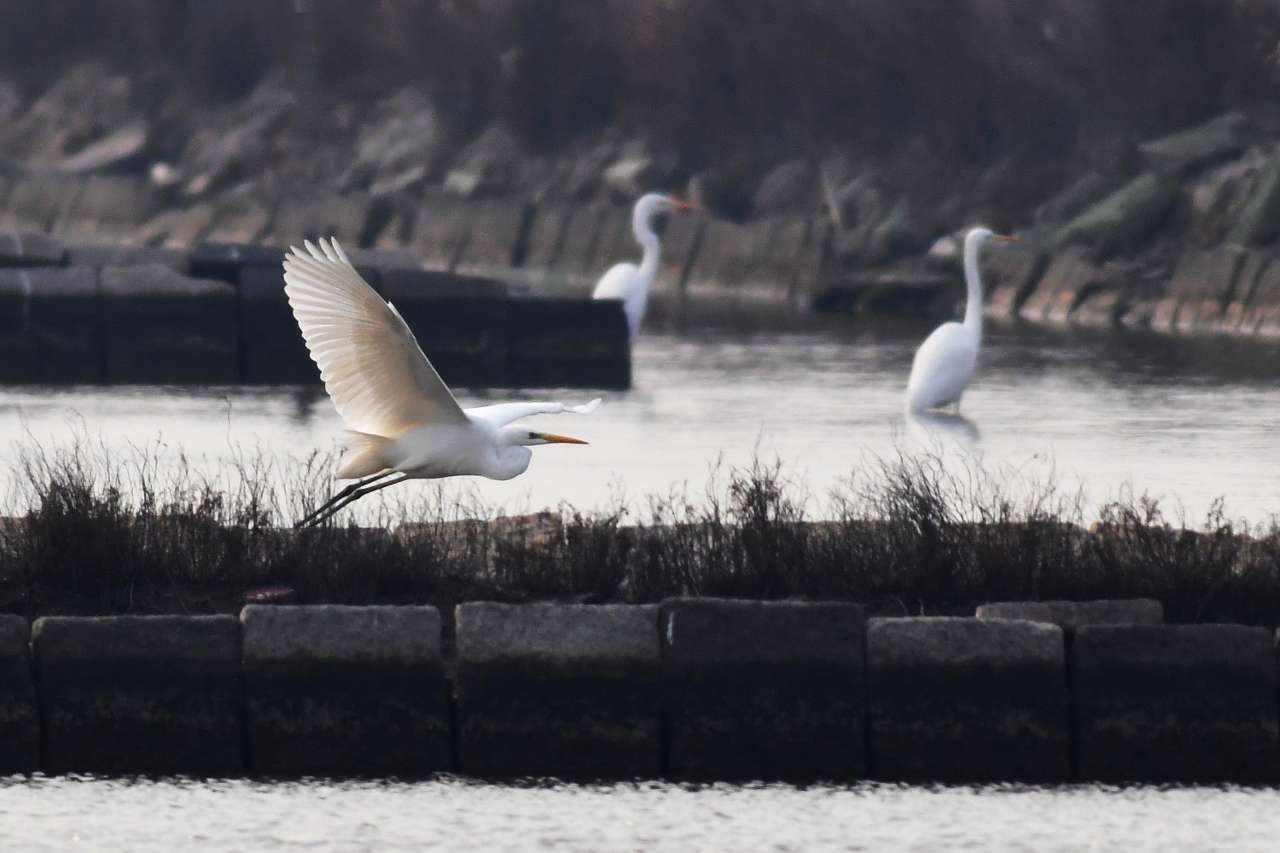 12月7日,三只白鹭在山东省青岛市城阳区河套街道滨海湿地觅食。
