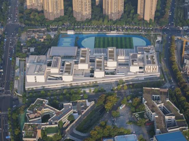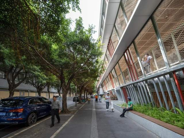 红岭中学石厦校区是深圳“8+1”新校园行动中唯一的改扩建项目。设计以退为进,增设街道公园与社区广场,缝合破碎的街道界面。其层叠的运动场结合通透立面,形成全年可用的自然通风风雨操场。这一实践为后续深圳“百校焕新”运动提供了重要范本。
