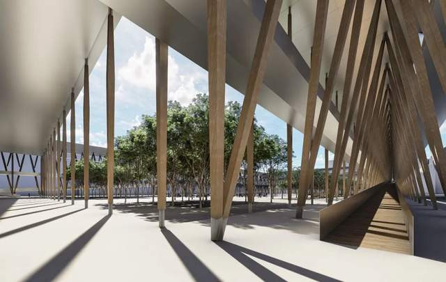 广东现代国际展览中心二号馆作为一座中型新馆,通过钢木连廊与现有展馆相连,围合出约2万平方米的城市广场。广场设有人行坡道引导至二层,激活上层展览空间,上方配备可开合遮阳雨篷,共同打造为多功能“城市客厅”。