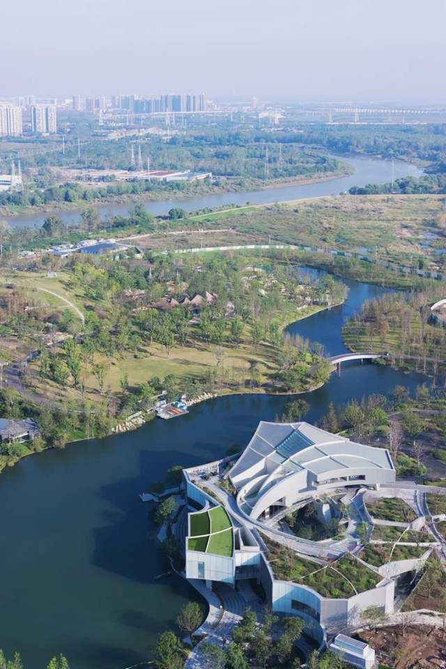 武汉麓洲艺展中心是成都万华在武汉的首个重要项目。其设计以水与涟漪为主题,通过动态曲线勾勒出轻盈形态,集多功能于一体。项目巧妙利用场地高差,通过不同入口引导人流,旨在打造滨水生态城的未来社区典范与标志性文化空间。