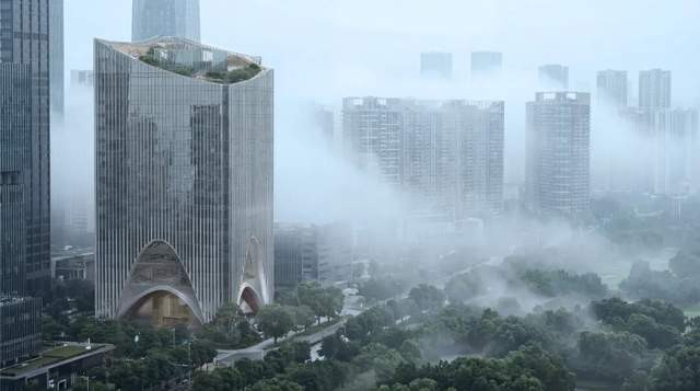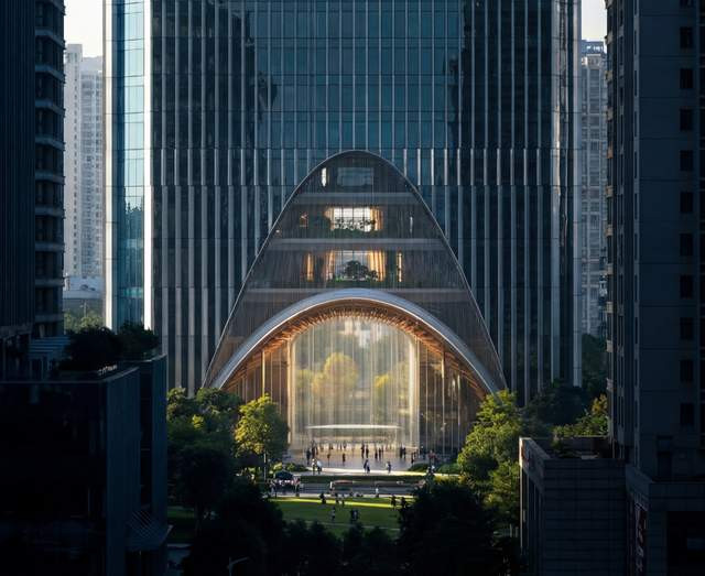 位于深圳湾超级总部的TCL半导体显示总部预计2026年启用。其设计以四个巨拱和开敞顶部,创新演绎高密度区域的“低矮塔楼”形态,并将结构形式延伸至公共空间。镂空相连的烟囱拔风中庭,以“低技”手法体现岭南建筑的质朴低碳理念。