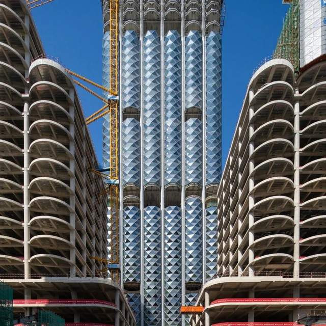 在上海张江之尚项目中,安藤忠雄将原“八连筒”横向切割为不规则形态,并将“十连筒”中部六个筒体收腰处理成“瘦筒”,打造为文化演艺空间。2025年11月,项目提前实现结构封顶,标志着关键建设节点完成,为后续装饰奠定基础。