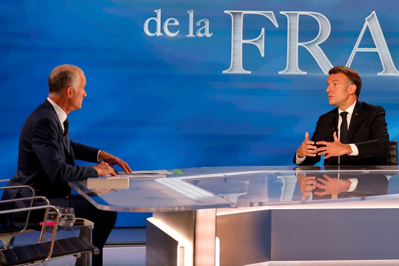 5月13日,法国总统马克龙(右)在圣但尼参加法国电视一台节目录制。马克龙在节目中说亿鑫网,欧洲若始终依赖美国将是“不负责任”。 新华社