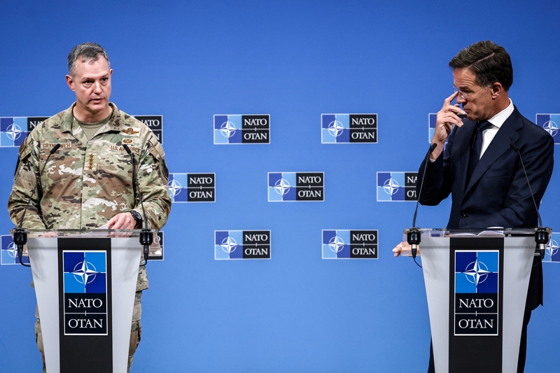9月12日,北约秘书长吕特(右)和北约欧洲盟军最高司令亚力克苏斯·格林克维奇在位于比利时布鲁塞尔的北约总部出席新闻发布会。新华社